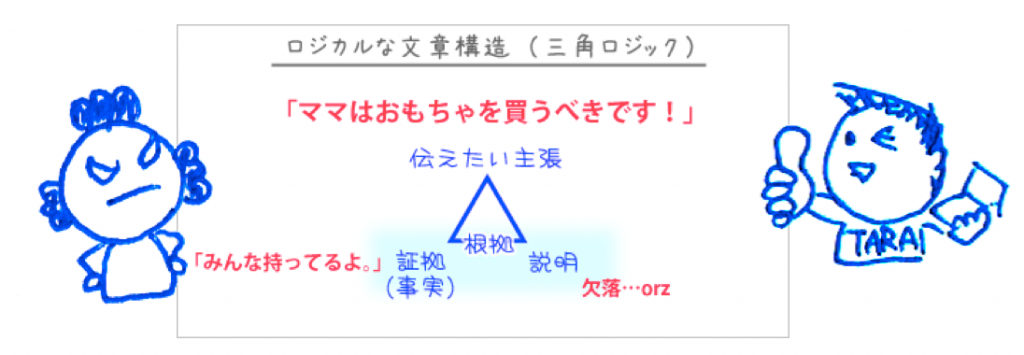 もちろん、三角ロジック以外にも、様々なレトリック(論法)があるわけなので、その場、その状況に応じて、相手に伝わりやすい筋道で語ってやる必要がありますね。